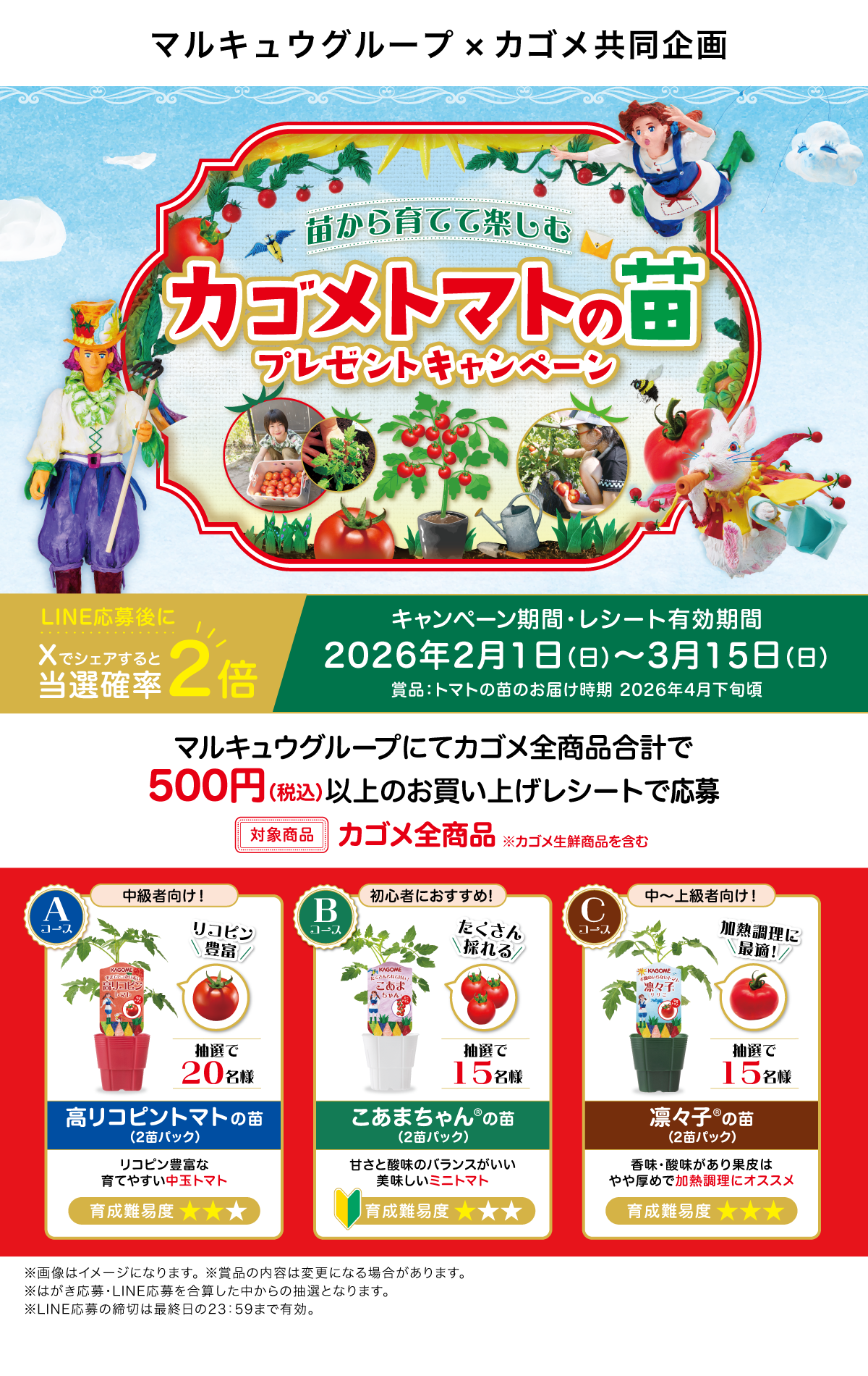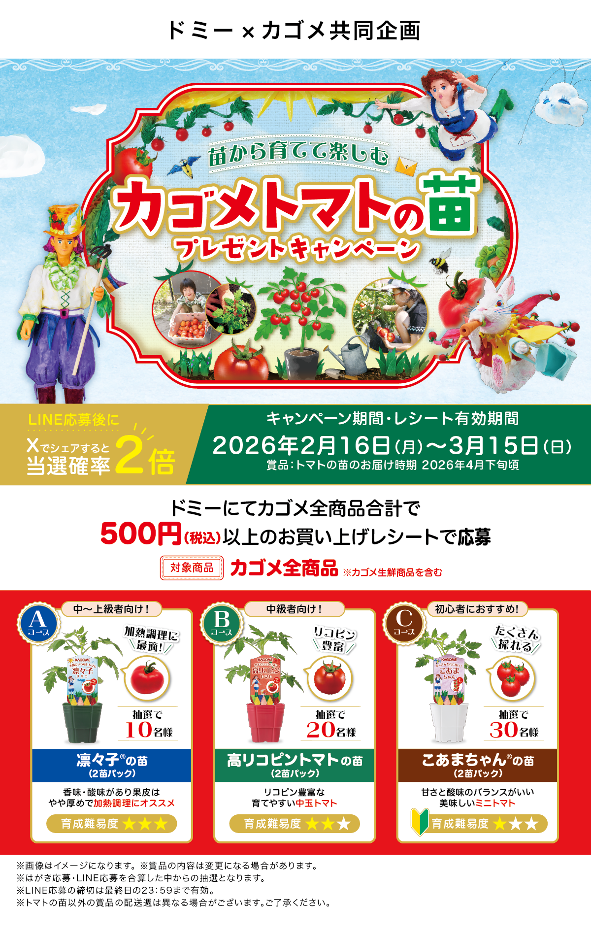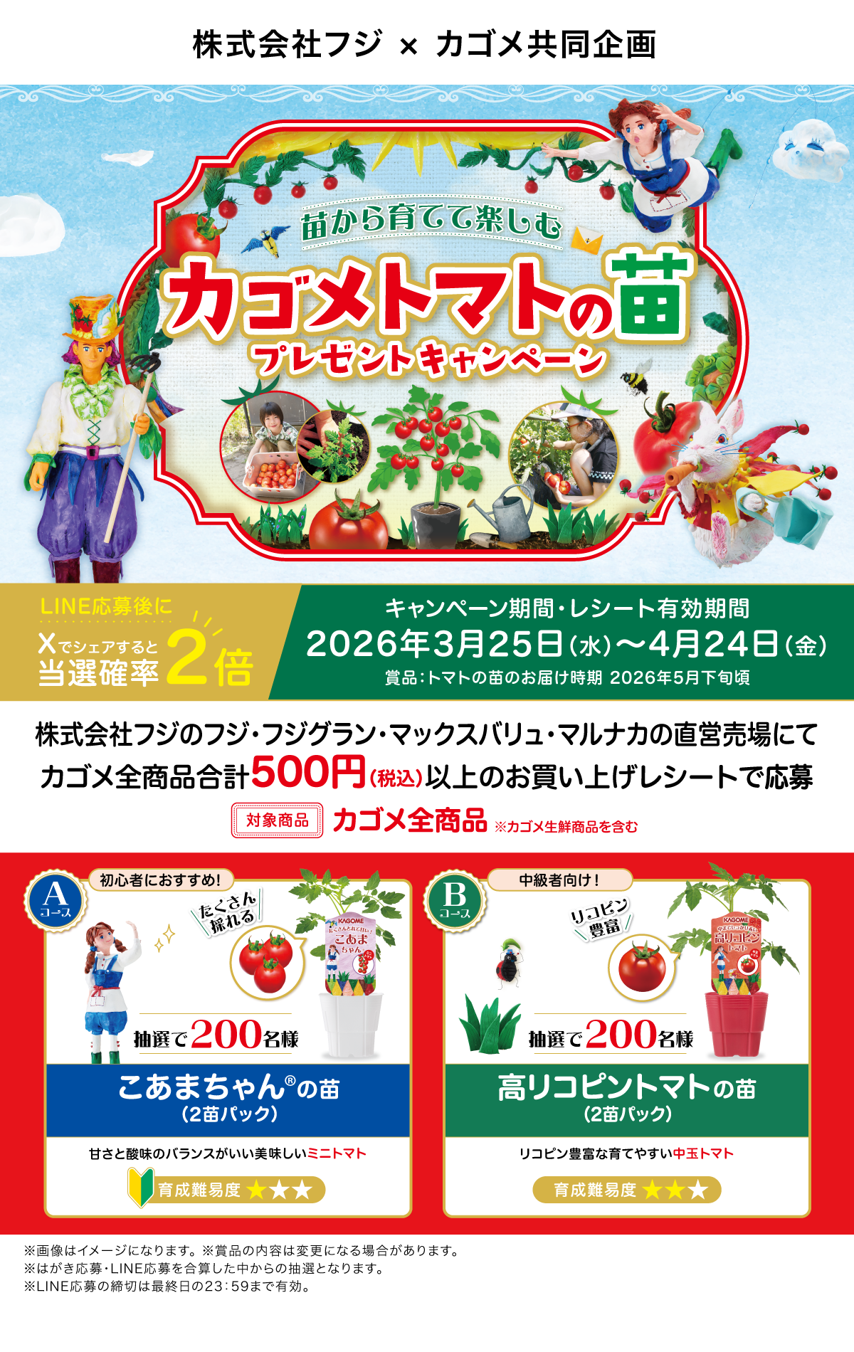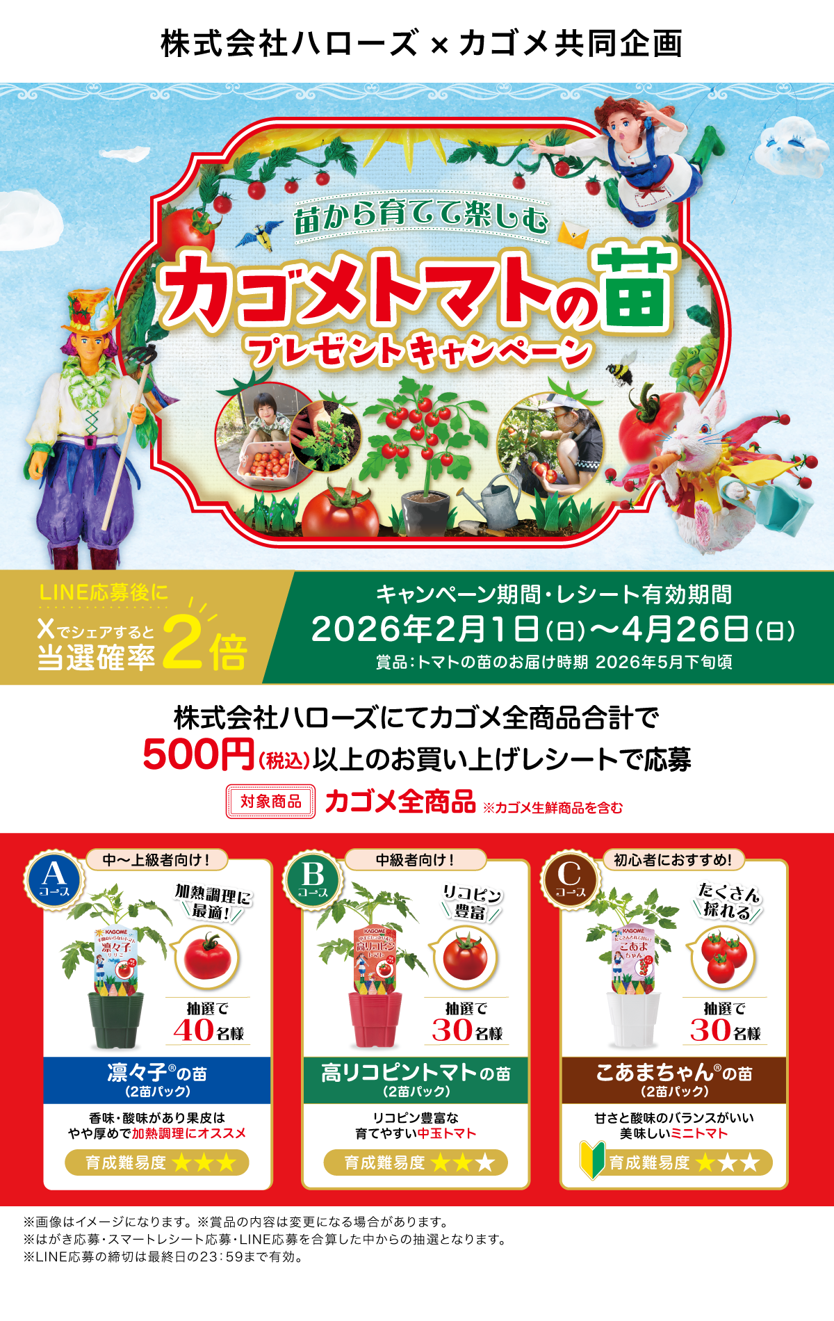 当選者の発表は厳正なる抽選の上、カゴメLINE公式アカウントから当選案内通知をもってかえさせていただきます。