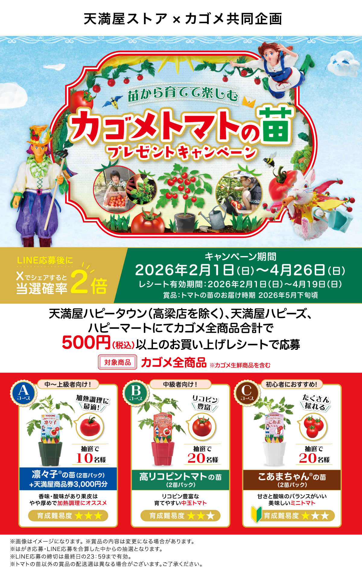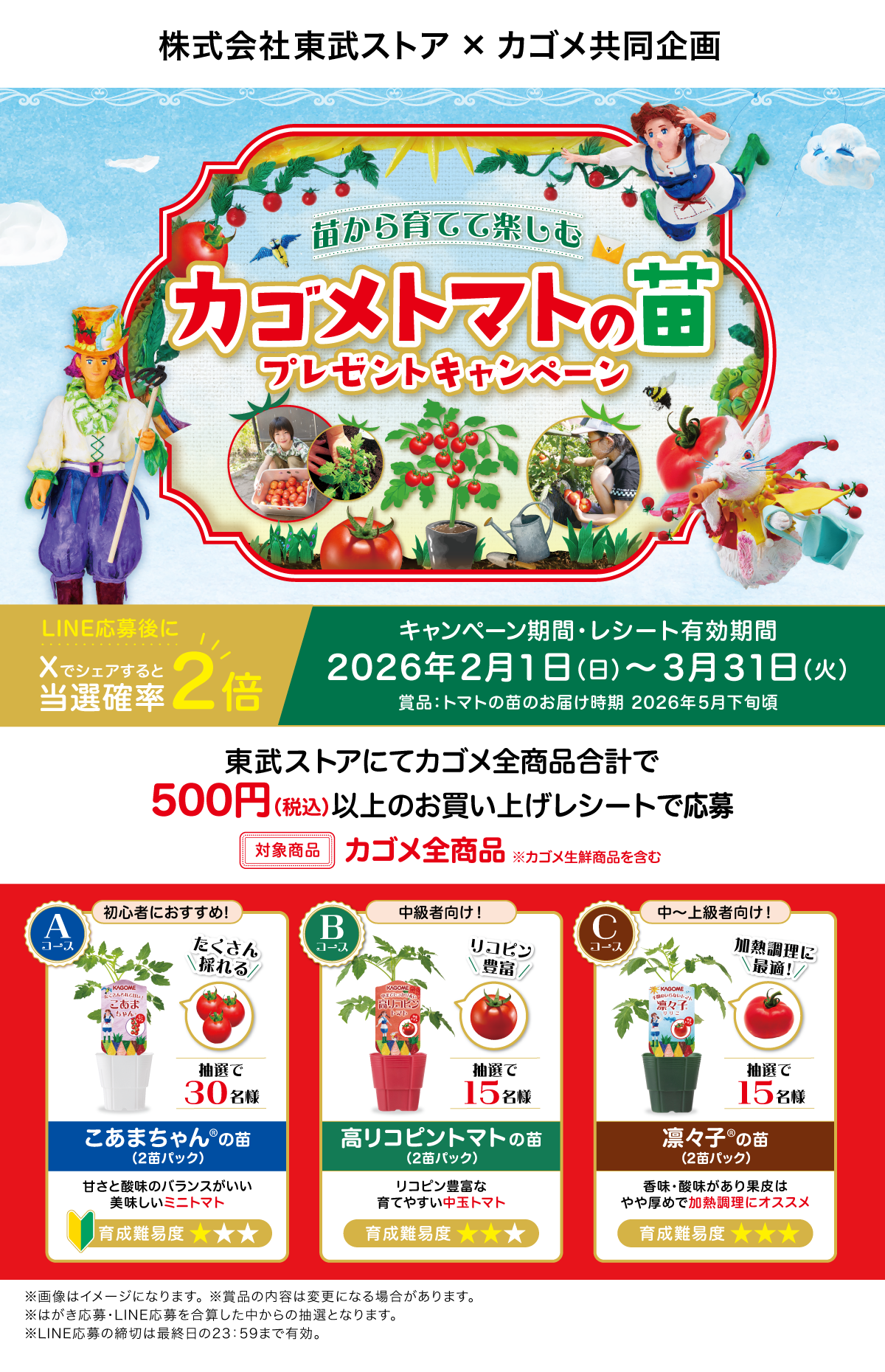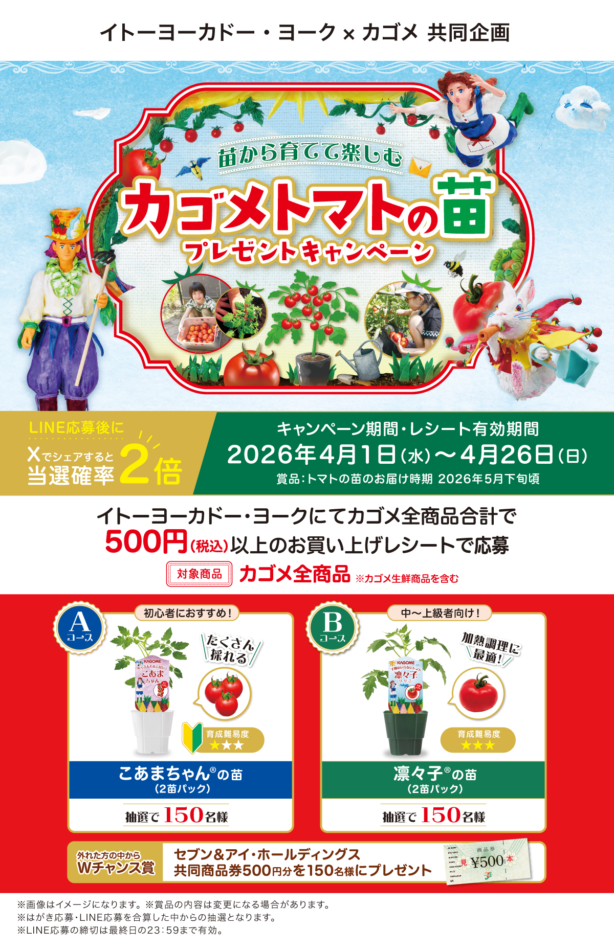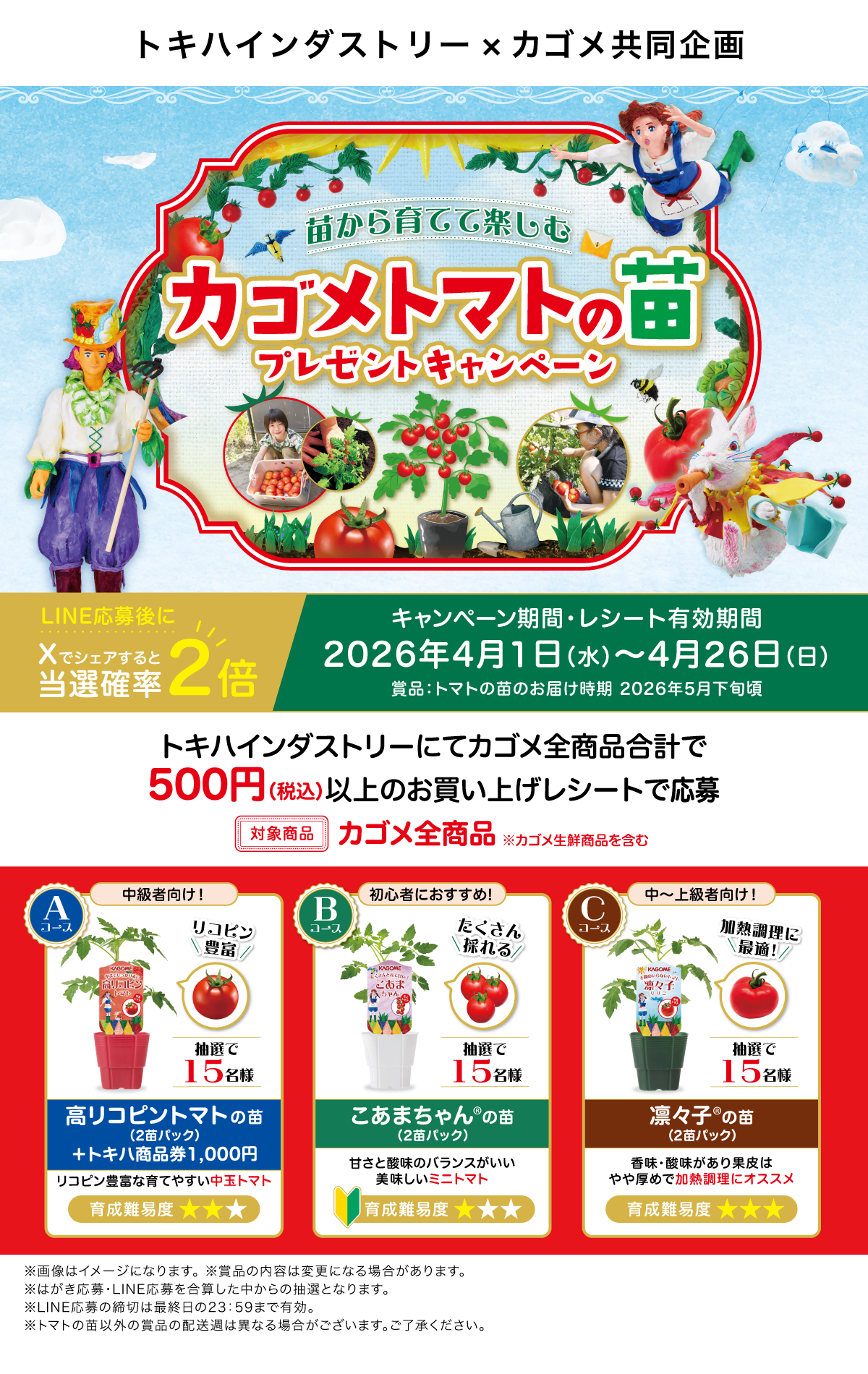 当選者の発表は厳正なる抽選の上、カゴメLINE公式アカウントから当選案内通知をもってかえさせていただきます。