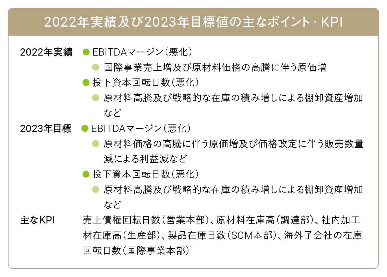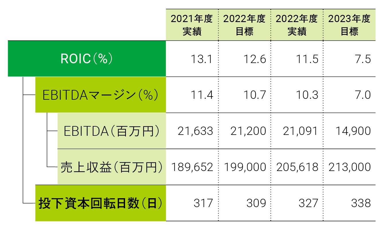 2022年度は、国際事業の売上収益が大幅に増加した一方、原料・エネルギー価格等の高騰により国内加工食品事業の利益が減少した結果、EBITDAマージンが減少しました。また、棚卸資産が大幅に増加したことにより、投下資本回転日数が増加しました。これは、原材料の高騰など外部環境の変化とそれに伴う対策として在庫確保を戦略的に進めたことによります。その結果、2022年度のROICは、目標から1.1point悪化し、11.5%となりました。