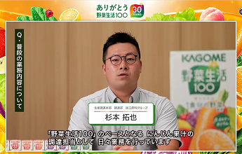 野菜生活の中で最も最も多く使われている野菜はにんじんです。カゴメでは、12~2月頃に収穫される、最も甘くておいしい、栄養価の高いニンジンだけを使っていますが、日本だけでは、採れる時期が限られてしまうので、世界中の農家さんと手を取り合って、北半球、南半球、それぞれに産地を持つことで、1年を通して安定して旬のものを調達出来る仕組みを作っています。その重要な原料を調達している、調達担当者と開発担当者のメッセージをお聞きいただきました。
