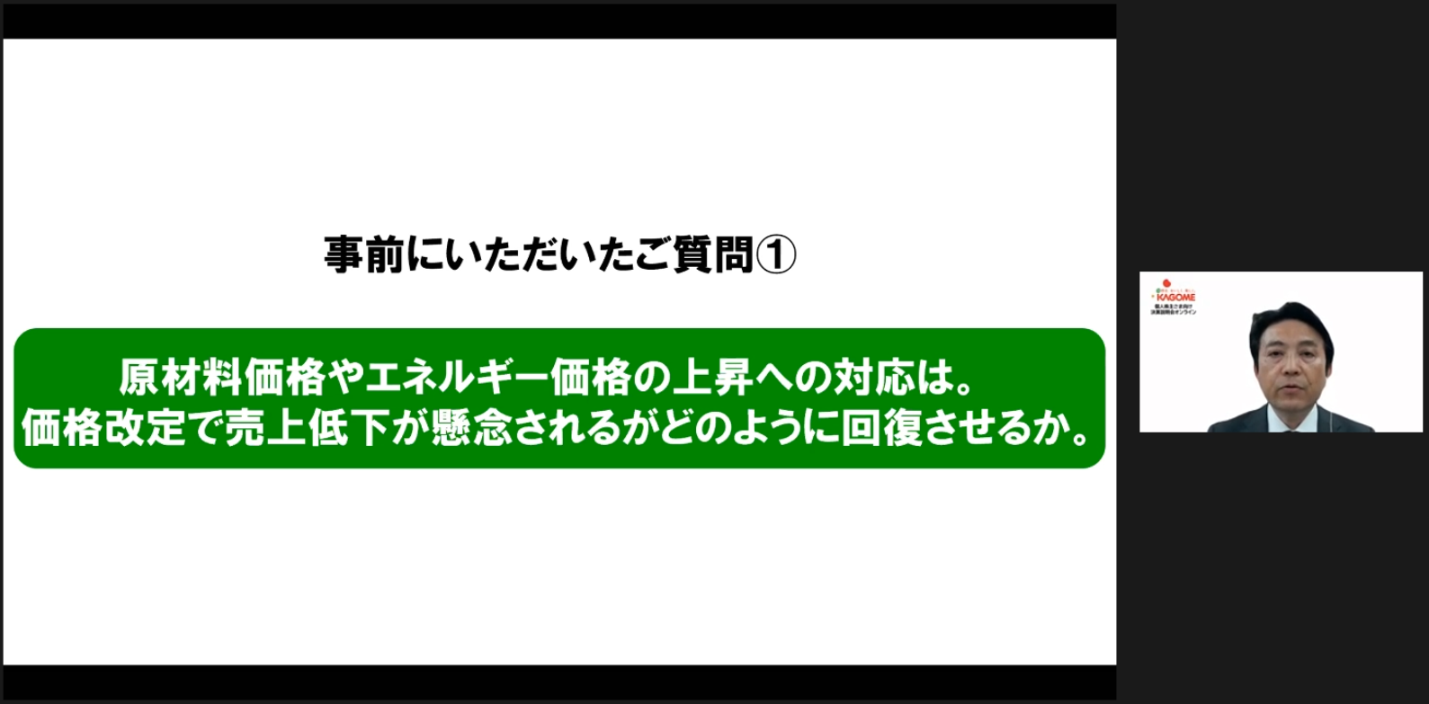 2023年2月1日から多くの商品の価格改定をさせていただいております。経験上、価格改定後には 商品の販売量が減少することがございます。そういった一時的な需要の落ち込みから、少しでも早く回復できるよう、先ほどの業績説明の中でお伝えをした販売促進や、野菜の色に着目した飲料プロモーション、あるいはケチャップの利用拡を目指した需要喚起イベントなどの活動を積極的に実施してまいります。また、商品のリニューアルによるバリューアップ、新商品の導入による様々なニーズの取り込みなどを進めることで、商品価値と魅力を高め、お客様に継続的にご購入いただけるよう努力してまいります。