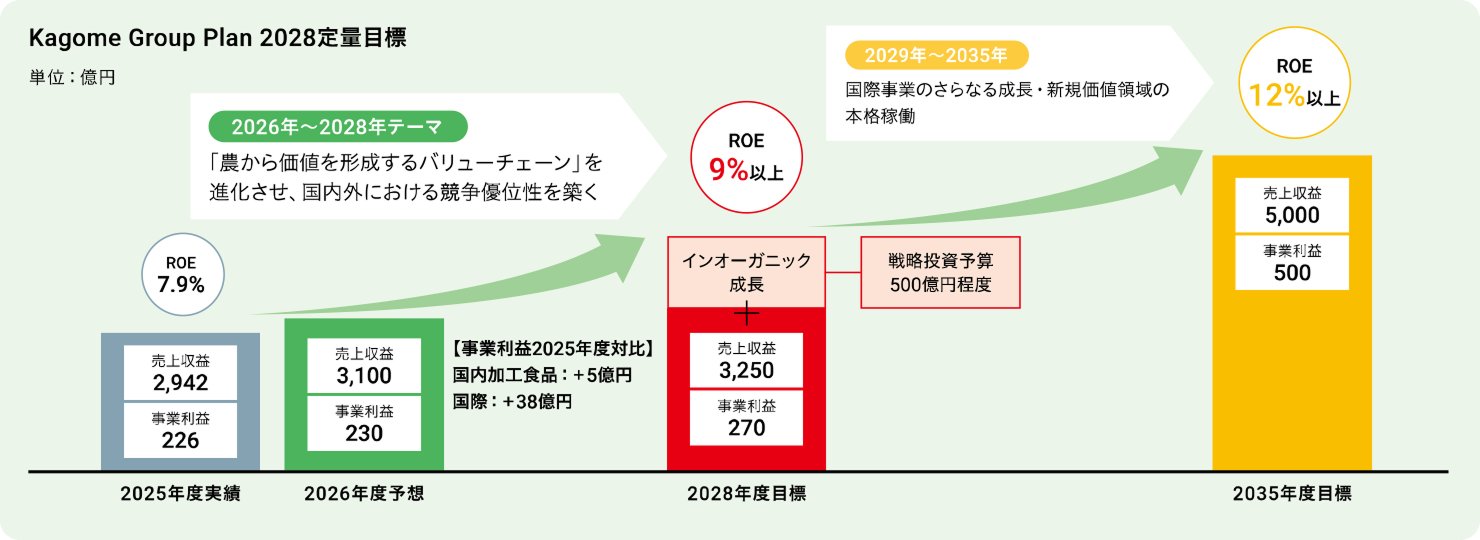 2035ビジョンの実現を目指して、2026年から2028年までのKagome Group Plan 2028では「『農から価値を形成するバリューチェーン』を進化させ、国内外における競争優位性を築く~独自の強み『農・技術・グローバルネットワーク』の相乗効果の最大化~」をテーマに掲げました。2029年以降に、国際事業及び新規価値領域が成長を大きく牽引していくためには、本中計期間における成長基盤の構築と競争力の強化が極めて重要となります。