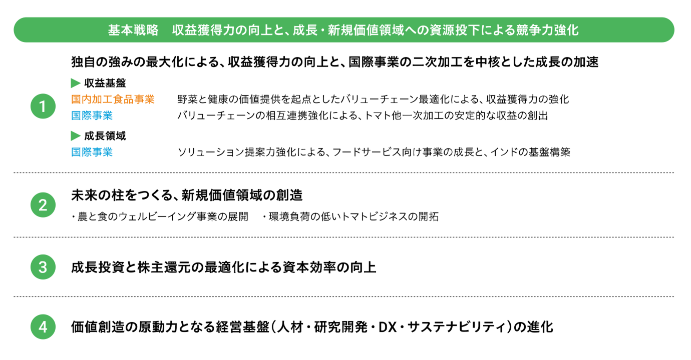 Kagome Group Plan 2028の基本戦略は、「収益獲得力の向上と、成長・新規価値領域への資源投下による競争力強化」です。この実現のため、4つの戦略を実行します。