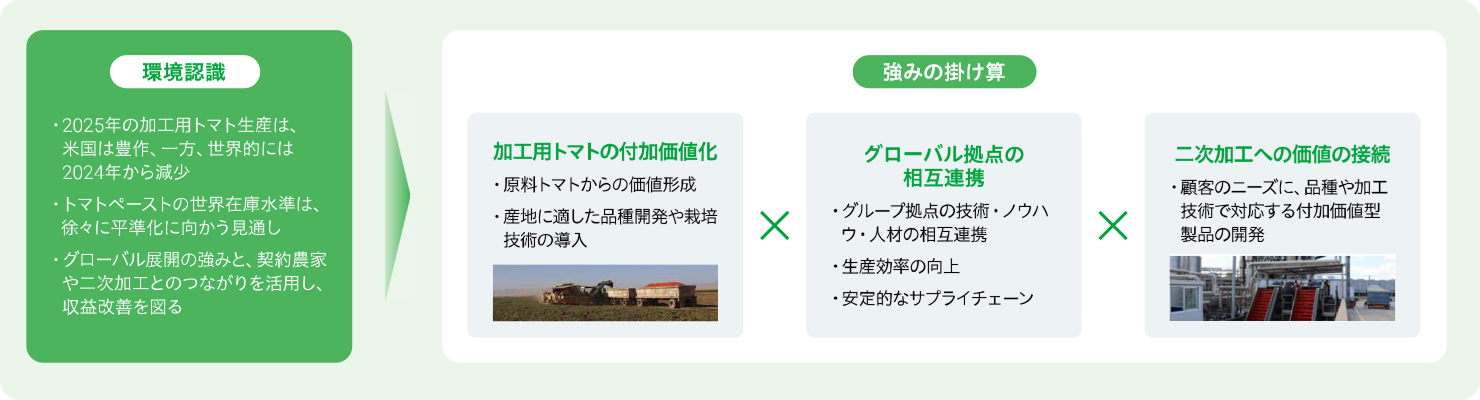 トマト他一次加工は、加工用トマトやトマトペーストの市況の影響を受けやすく、業績の変動幅が拡大しやすい特性を有しています。このため、市況変動を前提としながらも、適切な利益を安定的に創出できる事業構造への変革が課題です。これに対し、当社の強みを掛け合わせた一連の施策を通じて対応していきます。具体的には、GARBiCや契約農家との連携による加工用トマトの付加価値化に加え、製造工程における品質向上や原価低減活動の展開、さらにトマト他二次加工の顧客ニーズに対応した商品開発を進めます。これらは、一連のバリューチェーンを有する当社ならではの一貫した取り組みであり、収益基盤の強化と安定化につながるものと考えています。