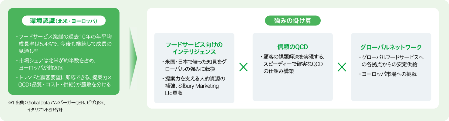 北米は世界のフードサービス市場の約半分を占め、大規模チェーン企業が多数存在します。今後はトマトペーストをベースとしたピザソースなどに加え、市場成長率の高いオイルベース、アジアンベースなどの商品開発力の強化や、容器のバラエティ化、マーケティング人員の補強によりソリューション提案力を強化していく必要があります。また、米国で培ったフードサービス企業向けの知見をグループ企業で連携し、グローバルの強みに転換していきます。