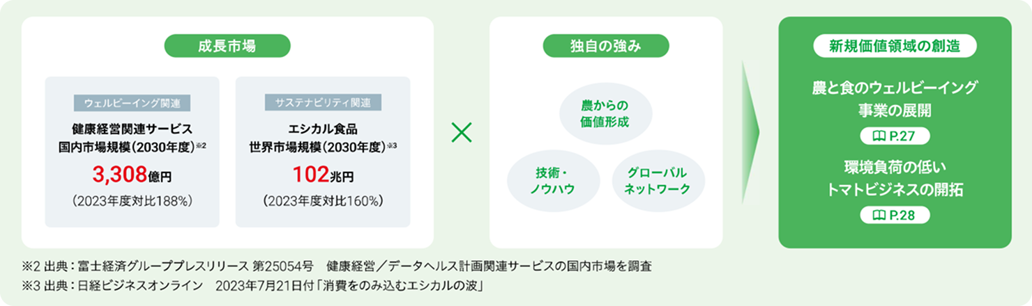 2035ビジョンの実現に向けて、今後確実に拡大すると予想されるウェルビーイングとサステナビリティの2つの市場に対し、カゴメらしく価値創造に取り組むことで、未来の成長の柱を創造します。取り組みの1つ目は「農と食のウェルビーイング事業」、2つ目は「環境負荷の低いトマトビジネス」です。これらを未来の成長の柱に位置付け、2028年までを価値開発フェーズとして、2029年以降の事業化へとつなげていきます。