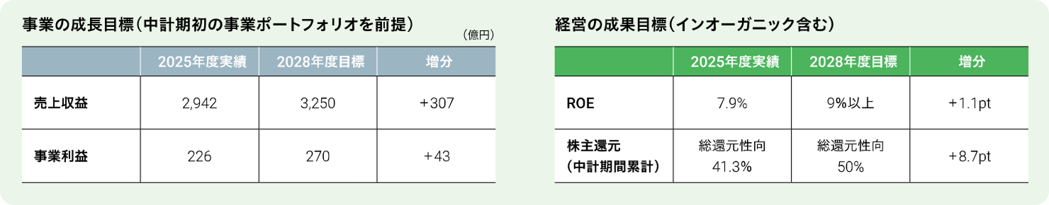 Kagome Group Plan 2028では、経営指標としてROE9%以上を目標に設定しています。また、期初の事業ポートフォリオを前提とした成長目標として、売上収益3,250億円、事業利益は270億円を掲げました。これに加え、約500億円規模の戦略投資予算枠を確保し、インオーガニック成長を含む将来に向けた成長機会の創出を推進していきます。