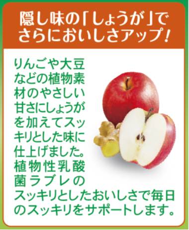 さらに、本商品発売と同時に「植物性乳酸菌ラブレプレーン」(130ml、80ml×3)をリニューアル致します。隠し味としてしょうがを新たに配合することでキレの良い後味を実現し、さらにすっきりとした美味しさをお楽しみ頂けるようになりました。