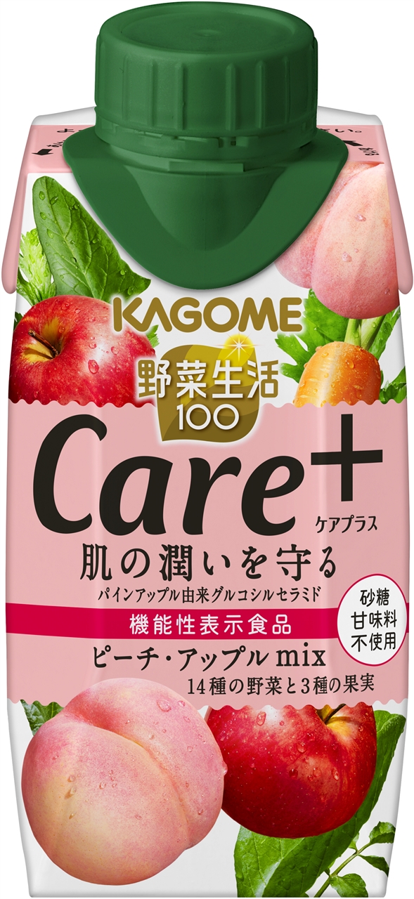 「野菜生活100 Care+ ピーチ・アップルmix」は、“肌の潤いを守る”のに役立つ機能が報告されているパインアップル由来グルコシルセラミドを配合しており、肌の乾燥が気になる方におすすめです。14種の野菜と3種の果実を使用し、とろりとした桃の味わいが特長です。