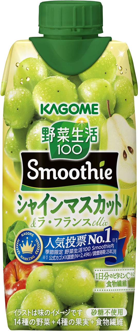 このたび発売する「野菜生活100 Smoothie シャインマスカット&ラ・フランスMix」は、カゴメ公式Xにて実施した季節限定「野菜生活100 Smoothie」人気投票企画において最多得票を獲得※1。シャインマスカットの爽やかな香りが特に好評だったことから、今年もおいしさそのままで再登場いたします。本品は、シャインマスカットの爽やかな香りと豊かな甘さを、濃厚なラ・フランスで引き立てた味わいの、野菜と果実の季節限定スムージーです。1食分の野菜※2を使用し、しっかり食物繊維と1日分のビタミンC※3を摂ることができます。