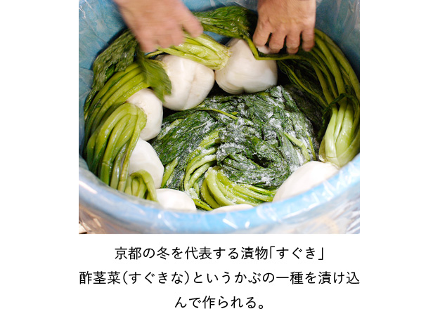 京都の冬を代表する漬物「すぐき」酢茎菜(すぐきな)というかぶの一種を漬け込んで作られる。