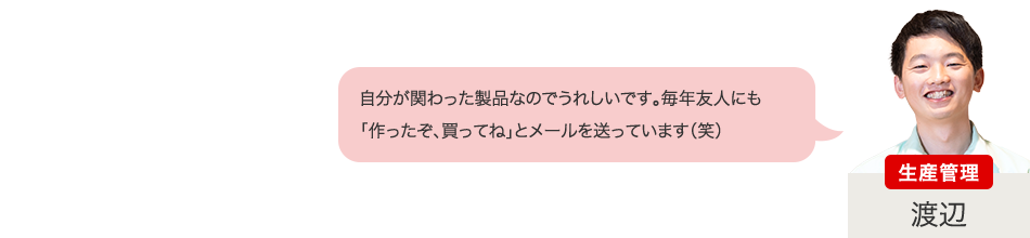 仕事のやりがいサプライヤーさんや本社部門との関わりの中で、自分の周りの環境がちょっとよくなっていると感じられるとうれしいですね。