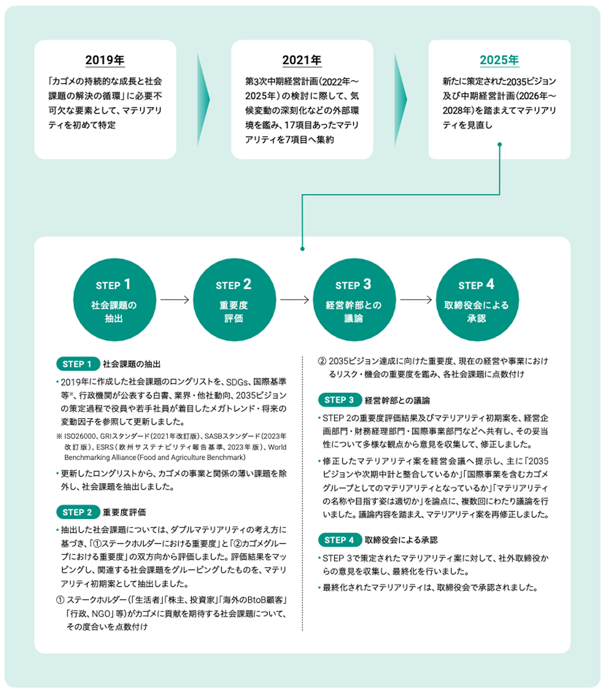 カゴメグループでは、マテリアリティを「カゴメグループの持続的な成長」及び「健やかで持続可能な地球環境と社会」を実現するための重要な経営課題と位置づけています。マテリアリティは2035ビジョン実現に向けた取り組みや持続的な経営・事業を支える基盤の取り組みを包括し、長い時間軸で取り組んでいく課題です。