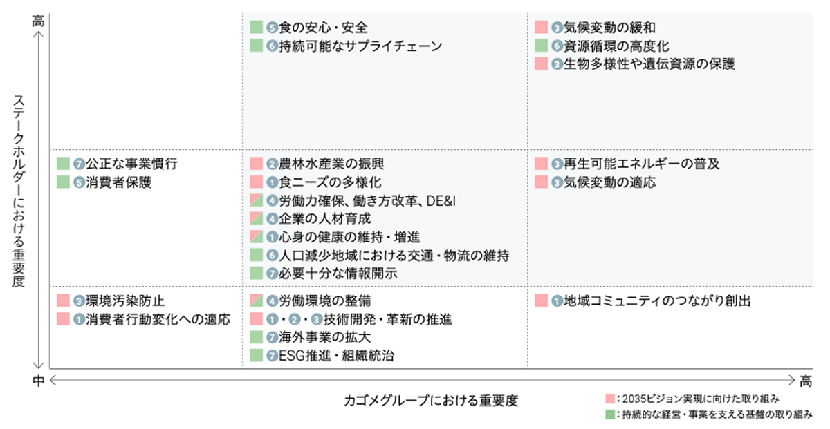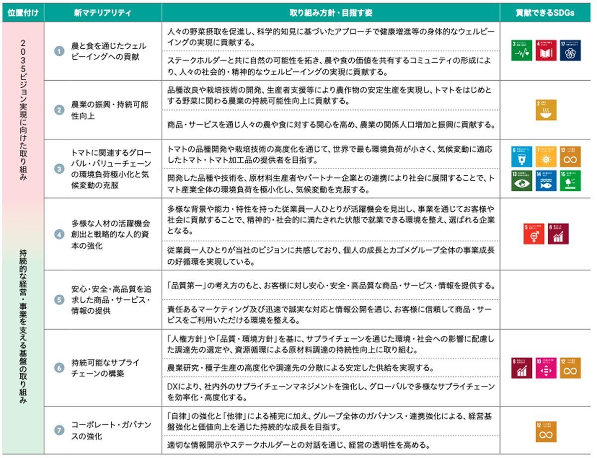 そして2025年、新たに策定された2035ビジョン及び中期経営計画(2026年~2028年)を踏まえてマテリアリティの見直しを行いました。今回行ったマテリアリティ分析では、ダブルマテリアリティの考え方に基づき、「自社における重要度」および「ステークホルダーと社会・環境にとっての重要度」について評価を実施しました。その結果、2035ビジョン実現に向けた取り組みとして「農と食を通じたウェルビーイングへの貢献」 「農業の振興、持続可能性向上」「トマトに関連するグローバル・バリューチェーンの環境負荷極小化と気候変動の克服」、持続的な経営・事業を支える基盤の取り組みとして「安心・安全・高品質を追求した商品・サービス・情報の提供」「持続可能なサプライチェーンの構築」「コーポレート・ガバナンスの強化」、両者を兼ねる取組みとして「多様な人材の活躍機会創出と戦略的な人的資本の強化」の7つのマテリアリティを特定しています。