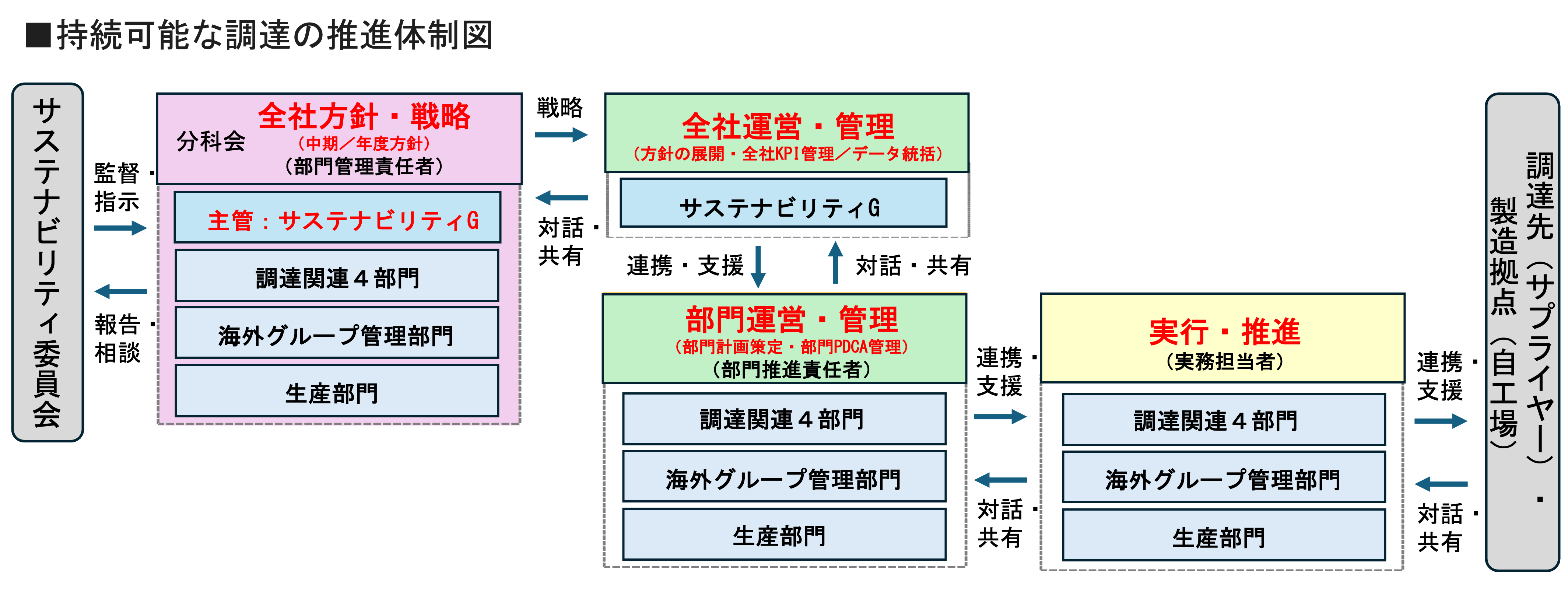 持続可能な調達は、調達部門だけでなく企業全体で取り組むべきテーマです。これまでも実務を担う調達部門と、全社のサステナビリティ推進を担う部門が連携して取り組んできましたが、2025年度より全社横断での議論をさらに深め、推進体制を再整備しました。2026年度からは、この連携を基盤として、持続可能な調達の実効性を高めるための運用を本格的に推進しています。