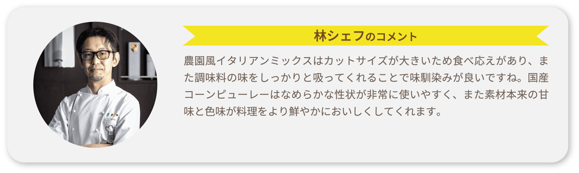 ミアッセとはイタリアのピエモンテ州北部の一部で食べられるクレープです。今回は生地にコーンピューレーを加え、コーンのやさしい甘味と彩り鮮やかな黄色が映えるクレープに仕上げました。季節やシーンによってミートソース・サルサやチリコンカンなど乗せる具材を変えることで、どんなシーズンでも楽しめる一品になります。