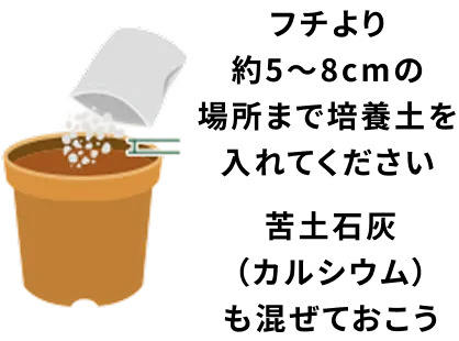 容器に鉢底石を敷き、市販の元肥入り培養土をフチより低い位置まで入れます。