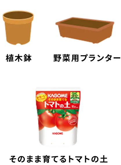 ※ミニトマトは、「KAGOMEそのまま育てるトマトの土」なら、袋にそのまま植え付けるだけで栽培が始められます。中玉・大玉トマトに使用すると、栽培条件により尻腐れ症が発生する可能性があります。