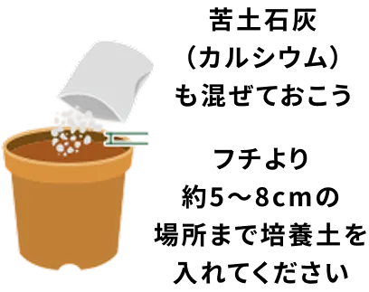 容器に鉢底石を敷き、市販の元肥入り培養土をフチより低い位置まで入れます。