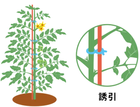 自立できない植物の茎や枝を支柱等に紐で固定し、成長する方向を調整して植物の形を整える作業を「誘引」といいます。