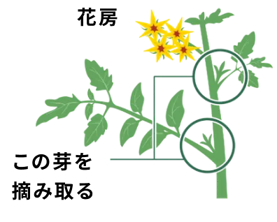苗は成長すると茎と葉の付け根部分から新芽が出てきます。これを「わき芽」といい、わき芽を除去する作業を「芽かき」といいます。