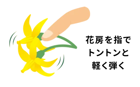 たくさんの実がなるように花が十分に開いたら花房を指で軽くはじくようにして、受粉・着果を促します。