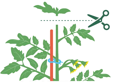 茎が支柱の高さに達したら、最後に実を着けたい花房の上の葉2枚を残して、新しい葉が展開する芽(成長点)を摘み取り摘芯します。