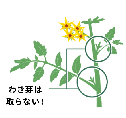 苗は成長すると茎と葉の付け根部分から新芽が出てきます。これを「わき芽」といい、わき芽を除去する作業を「芽かき」といいます。