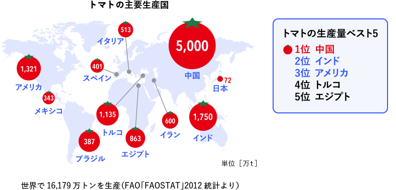 トマトは世界のさまざまな国で栽培されています。では、どの地域でどれくらいの量が生産されているのでしょうか?