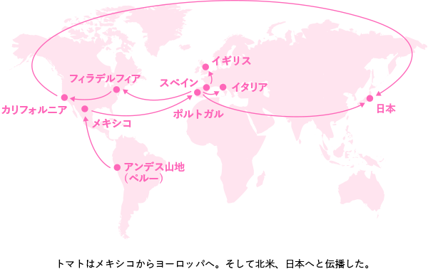 トマトという呼び名は「膨らむ果実」を意味する「トマトゥル」からきています。はるか昔、メキシコ湾をのぞむベラクルス地方のアステカ人がこう呼んだのが始まりです。トマトゥルとは元来「ホオズキ」を指し、メキシコではホオズキを煮込んで料理に使っていたところから、形がよく似たトマトも同じ名前で呼ばれたようです。