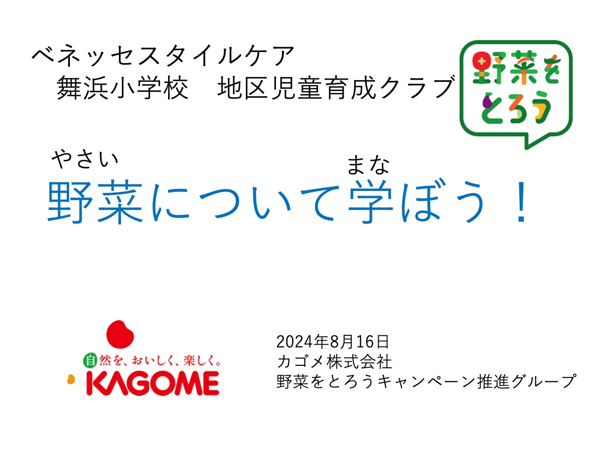 実施日:2024年8月16日 株式会社ベネッセスタイルケアとカゴメ株式会社は2024年8月16日(金)、 ベネッセスタイルケアが運営する「浦安市舞浜小学校地区児童育成クラブ」に通う小学1~6年生を対象として、訪問授業を実施しました。 また、授業翌日には、参加した児童やスタッフ全員から御礼の手紙を受領しました。株式会社ベネッセスタイルケア/カゴメ株式会社