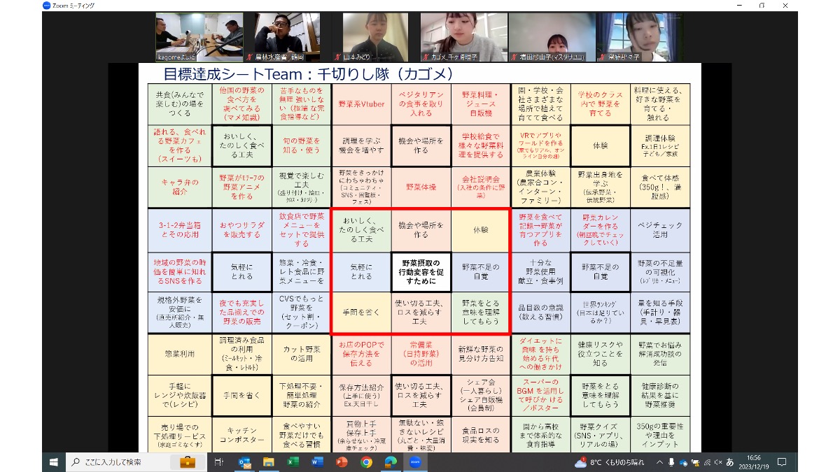 実施日:2023年9月13日~2024年2月20日 農林水産省主催のワークショップ「Z世代と企業のアイディアで食育を推し活!」に、カゴメ、株式会社明治、キユーピー株式会社、コープデリ生活協同組合連合会、日本マクドナルド株式会社の5社が参加しました。 2023年9月13日(水)から約半年間にわたり行われた本ワークショップで、チームカゴメは「野菜摂取の行動変容を促すために」をテーマにリアル・オンライン含め5回のミーティングを実施。目標達成シート(マンダラート)をもとに、各学生が食育活動に関しての提言と提案を作成しました。 作成した提言は、2月20日(火)に農林水産省主催で開催された「食育推進フォーラム」で発表。行動変容を促すためのポイントとして「おいしく、たのしく」「共食の場」「体験」を置きながら、学生たちからは「高校での食育授業の実施」「共食の促進を目的とする“ノー孤食デー”」「働く世代の多様なライフスタイルに応じた環境づくり」などの具体策を示しました。農林水産省・カゴメ株式会社