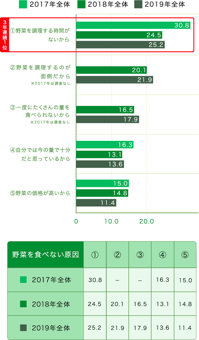 野菜を食べられない原因では「調理する時間がないから」が毎年最も多い原因。