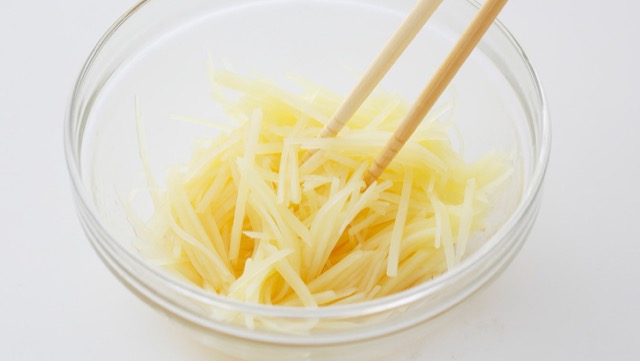 せん切りや細切りにして水にさらせば、サクサク、シャキシャキとした歯ごたえに。生で食べてもOKですが、ソテーや中華炒めにしたり、サッと湯がいてなますやナムルにしたりと、新じゃがいもでしか味わえない食感を活かした料理ができます。大きな粒のものを使うと、長さがあって扱いやすいでしょう。