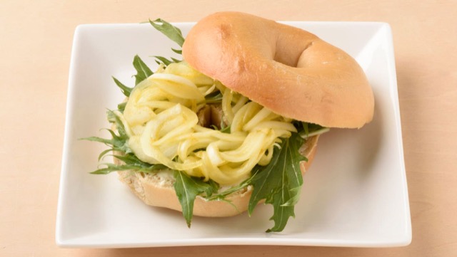 新タマネギの甘みとカレーのスパイスが食欲をそそる、彩りもきれいなベーグルサンド。