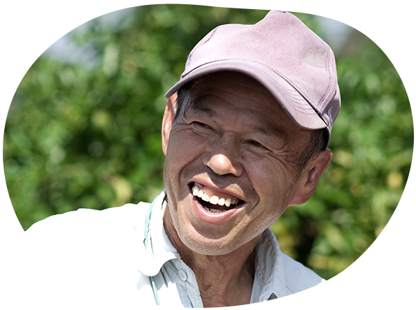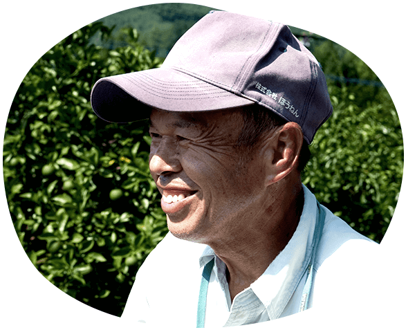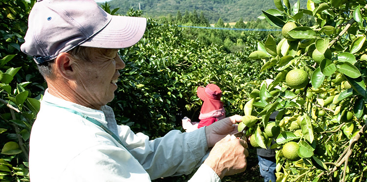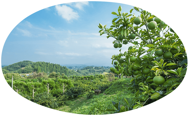 元禄8年(1696年)、漢方医が都から苗木を持ち帰り育てたのが始まり、という言い伝えが残る臼杵市乙見地区には、その元祖木が残っています(原木は昭和63年に枯れてしまい、現在あるのは2代目)。かぼす栽培ひとすじ25年のベテラン、峯さんの畑は、その元祖木のすぐ近く。山の斜面を切り拓いた園地に、青々としたかぼすが枝を広げています。小さい頃には、お母さんがかぼすを搾って砂糖を入れてくれた飲み物がたまらなく美味しかったと、懐かしそうな笑顔の峯さん。「風邪のひき始めなんかにも飲みよるし、みそ汁にも入れるんよ。刺身、焼き魚…何にでもかぼす使っちょるなぁ」。今は、仕事の後の一杯に「かぼすをちょっと搾ってクイーッとやる」のが、活力の源だそうです。