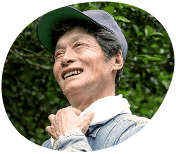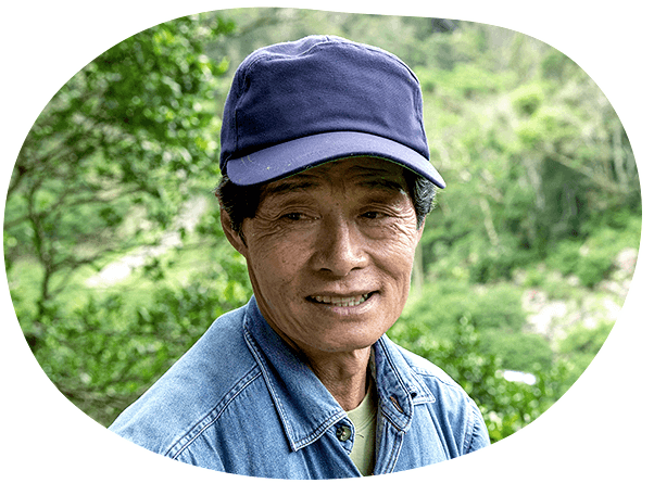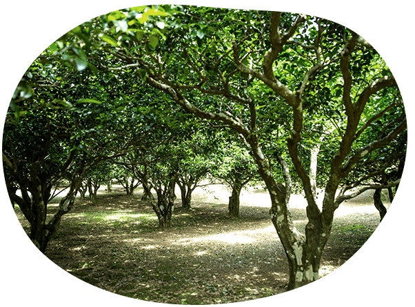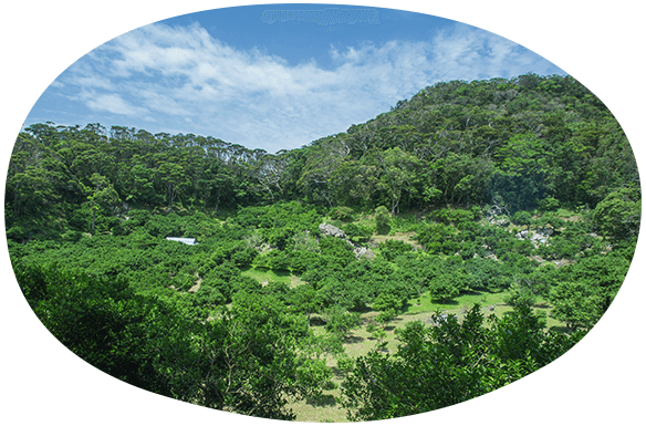 周囲をゴツゴツとした岩肌の山に囲まれた大きなすり鉢状の地形「ドリーネ」を利用して整備された園地は、亜熱帯のグリーンガーデンのように魅力的!小橋川家3代の丹精の賜物です!「畑には、両親が農作業する姿や、兄弟で転げまわって遊んだ思い出がいっぱいつまってる。シークヮーサーは一緒に大きく育ってきた幼なじみのようなものさぁ。この畑に来るとシークヮーサーから元気のパワーをもらえる感じで、気持ちが清々しくなるねえ」。