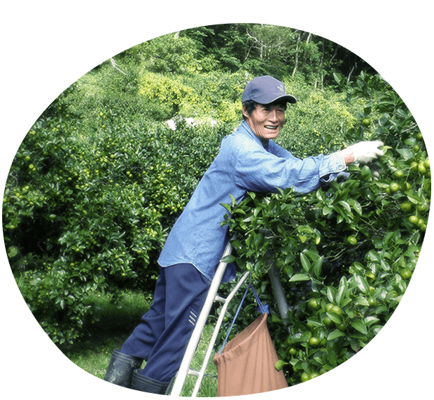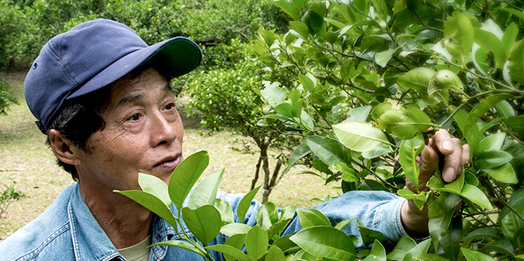 「親父がこの畑にシークヮーサーを植えたのは、僕が小学生の頃だから、もう50年以上。おじい(祖父)の代から自生していたものは樹齢100年以上かな!」と語ってくれたのは、生産者の小橋川さん。